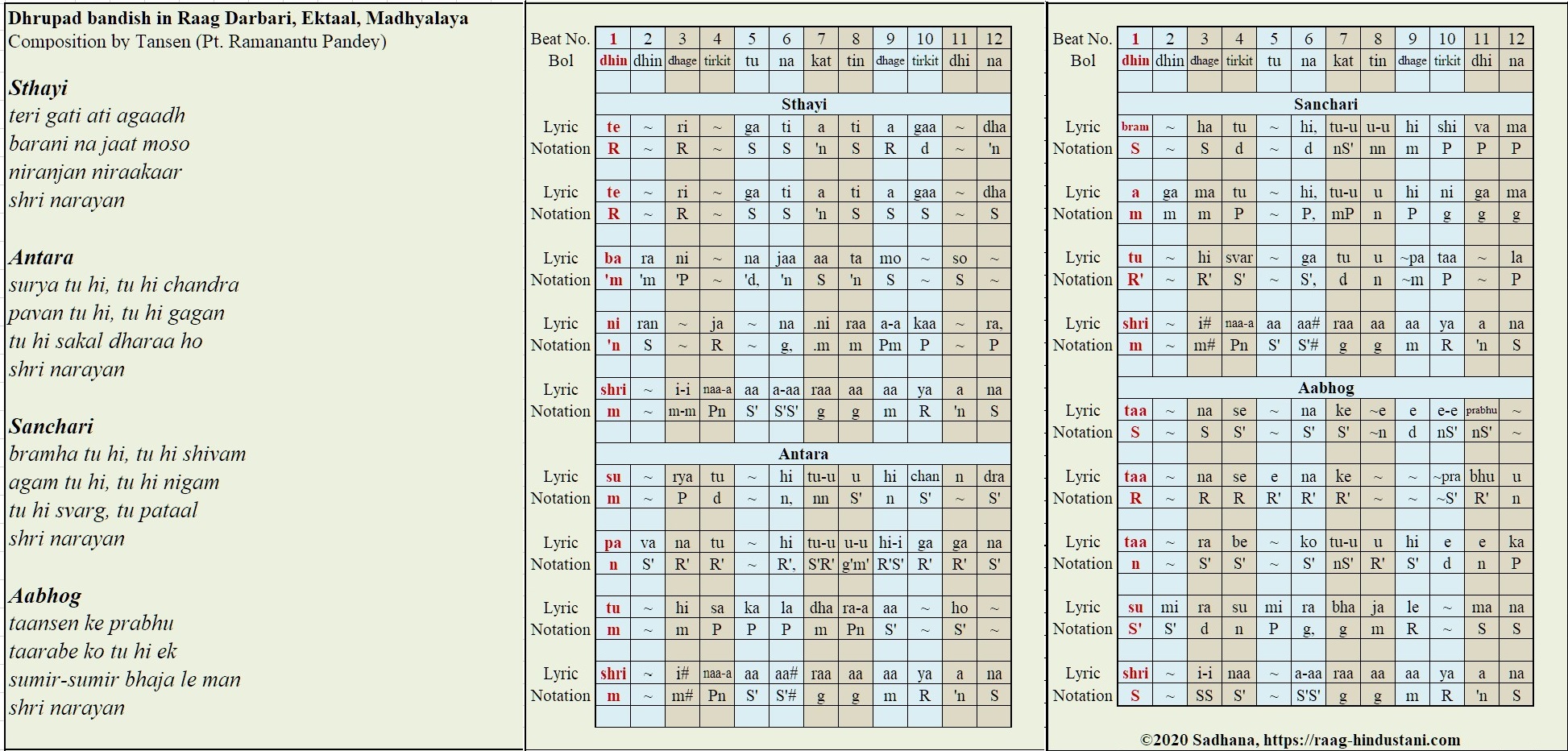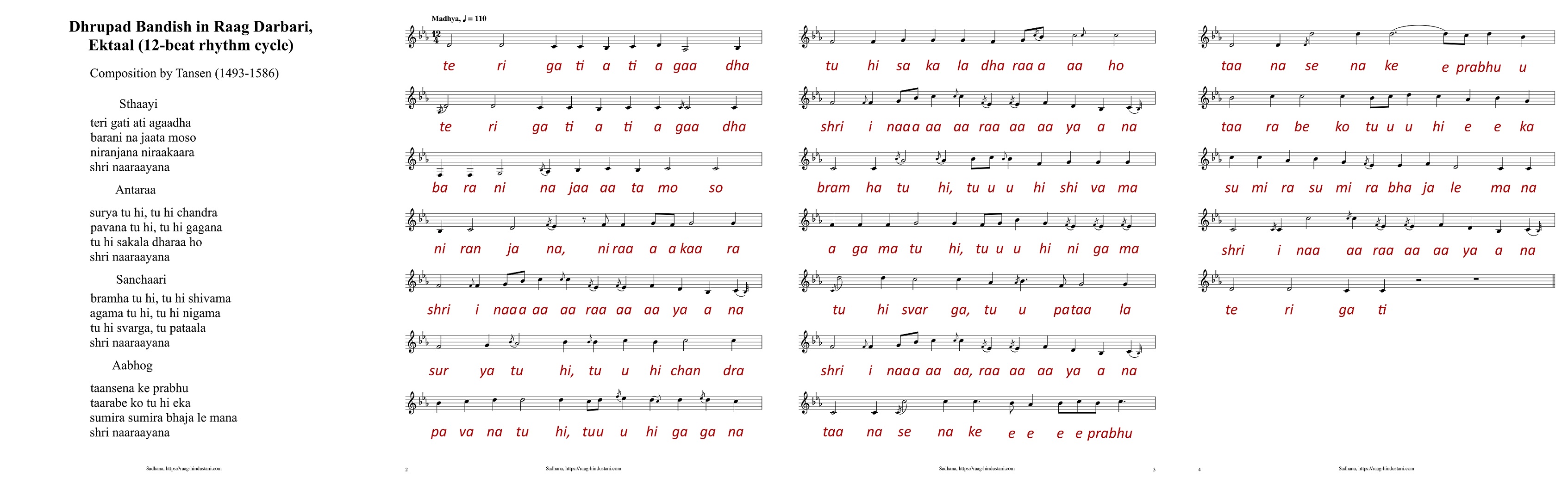 This very ancient composition in Raag Darbari is a Dhrupad madhyalaya bandish by Tansen (Ramtanu Pandey, 1493-1586). It is originally set to Chautaal (12-beat rhythm cycle), but can also be performed in Ektaal (12-beat cycle). The composition is a hymn to Lord Vishnu. A line-by-line translation is provided in the video as well as with the downloadable notations below.